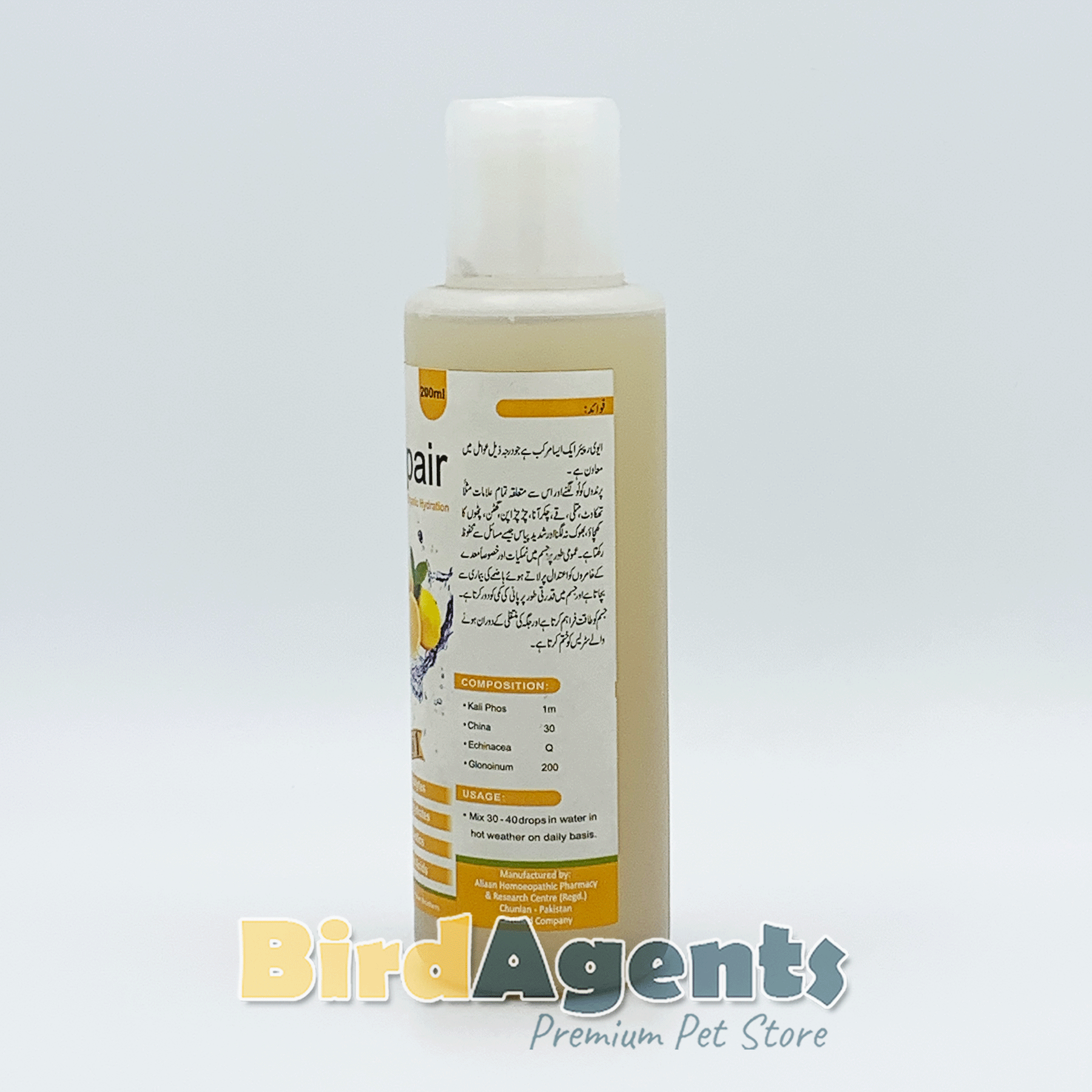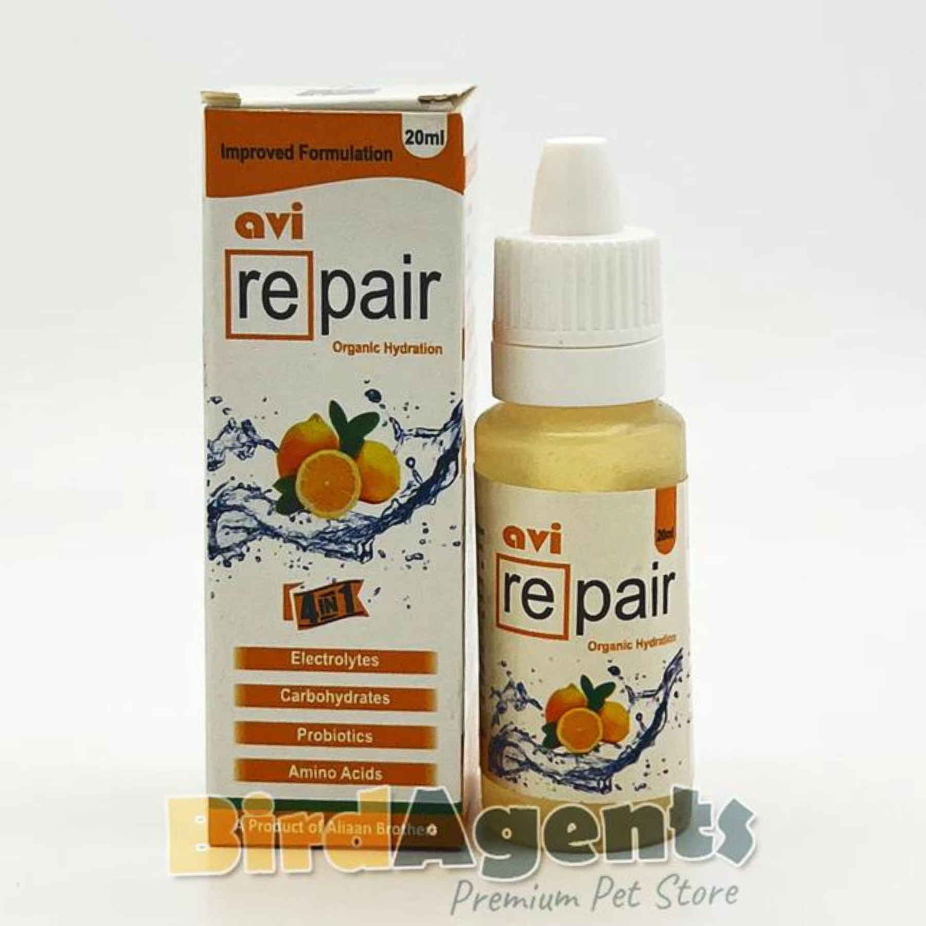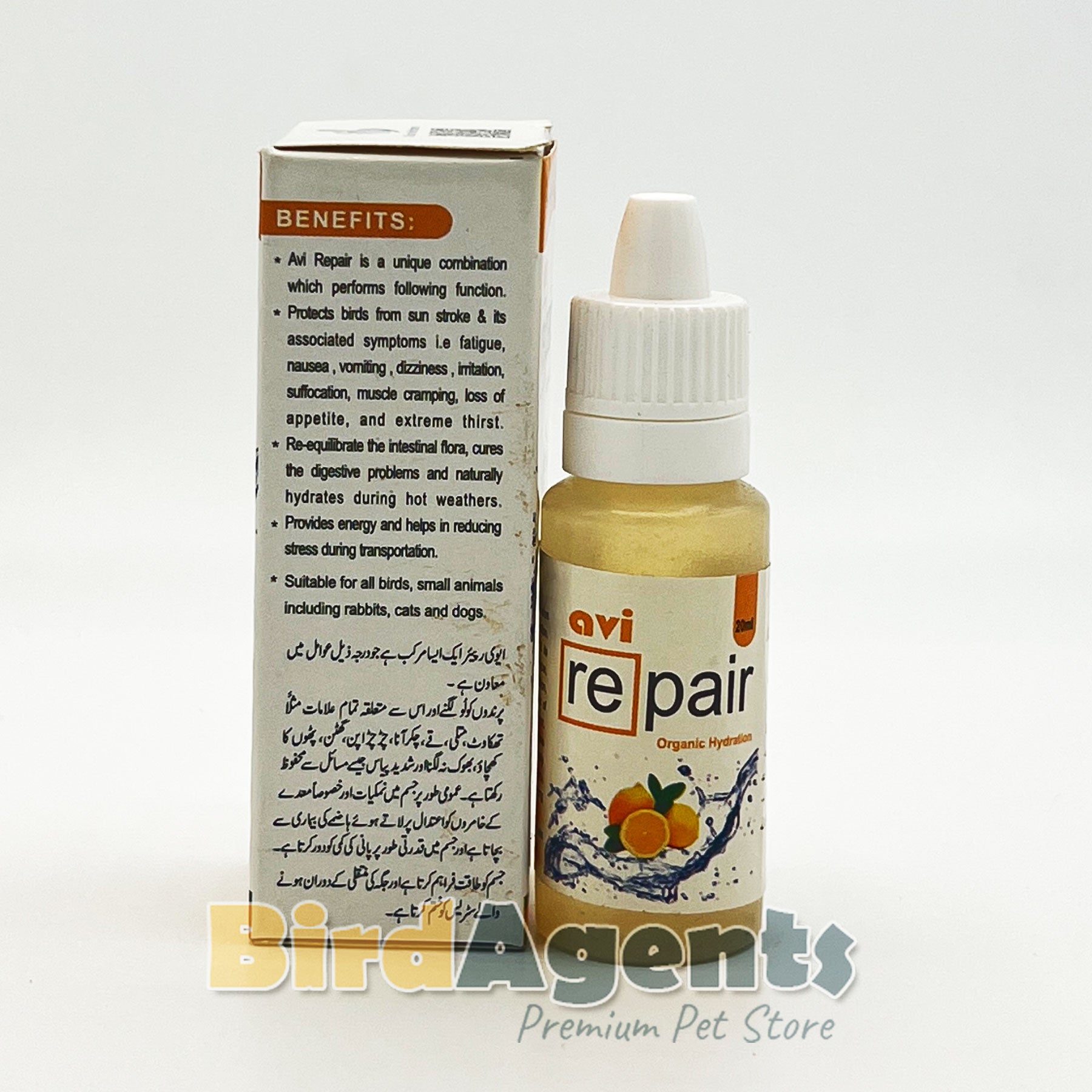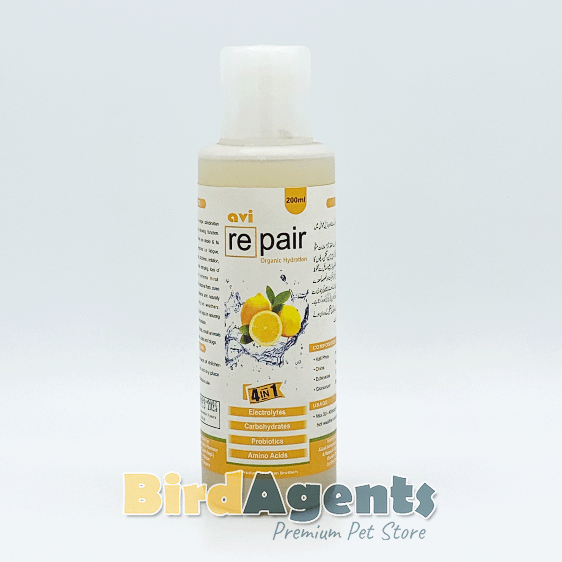 Description: Avi Repair is a unique formulation designed to protect birds from sunstroke and its associated symptoms, such as fatigue, nausea, vomiting, dizziness, muscle cramping, loss of appetite, and extreme thirst. It also helps re-equilibrate intestinal flora, cures digestive issues, and naturally hydrates during hot weather. Additionally, it provides energy and reduces stress during transportation.