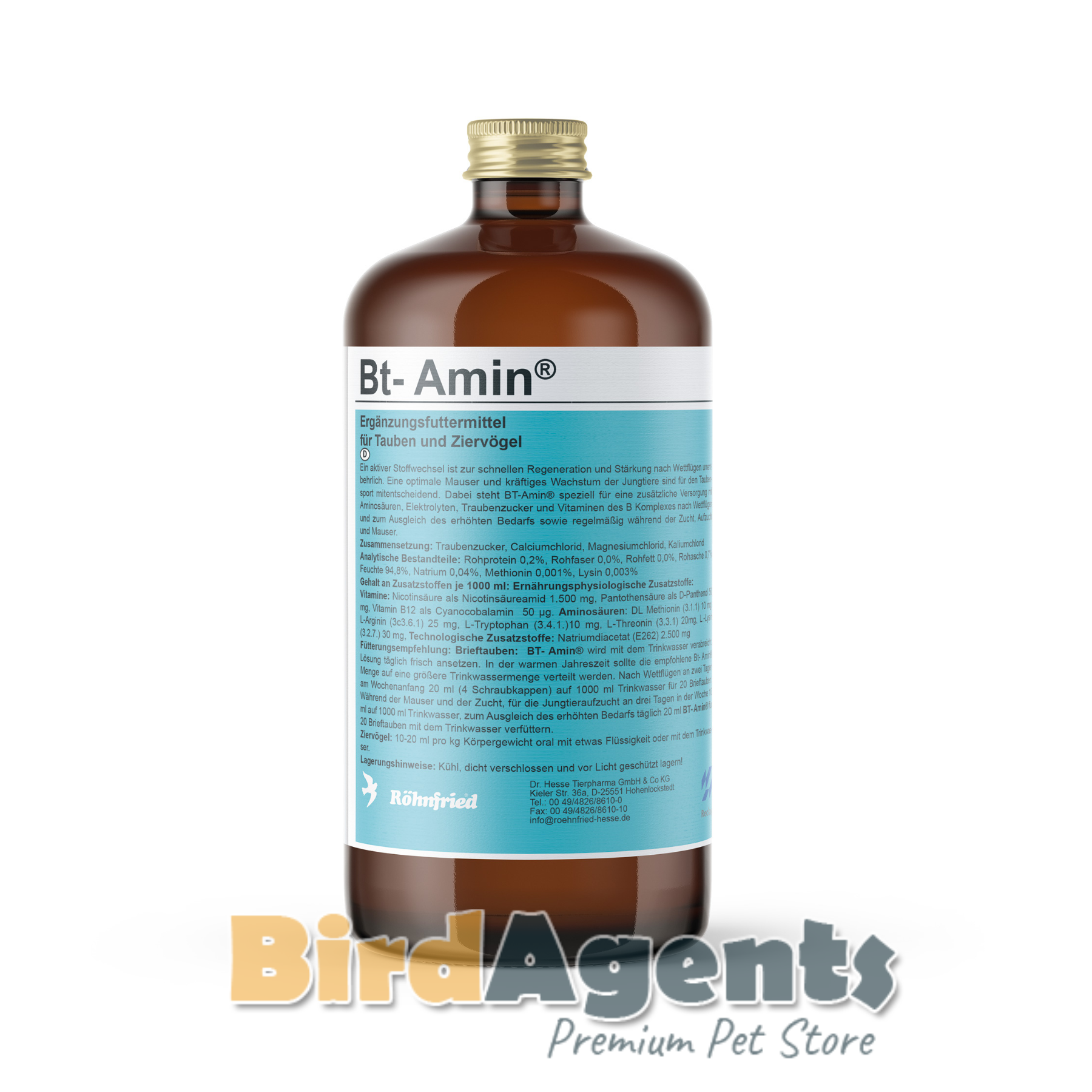 Feeding recommendation: Racing pigeons: Bt-Amin® is fed with drinking water. Prepare a fresh solution every day. In the warm season, the recommended Bt-Amin® amount should be distributed over a larger amount of drinking water. After races, add 20ml (4 screw caps) to 1,000ml of drinking water for 20 racing pigeons on two days at the beginning of the week. During moulting and breeding, for raising young animals, add 10ml to 1,000ml of drinking water three days a week. To compensate for the increased need, add 20ml of Bt-Amin® daily to 20 racing pigeons with the drinking water.