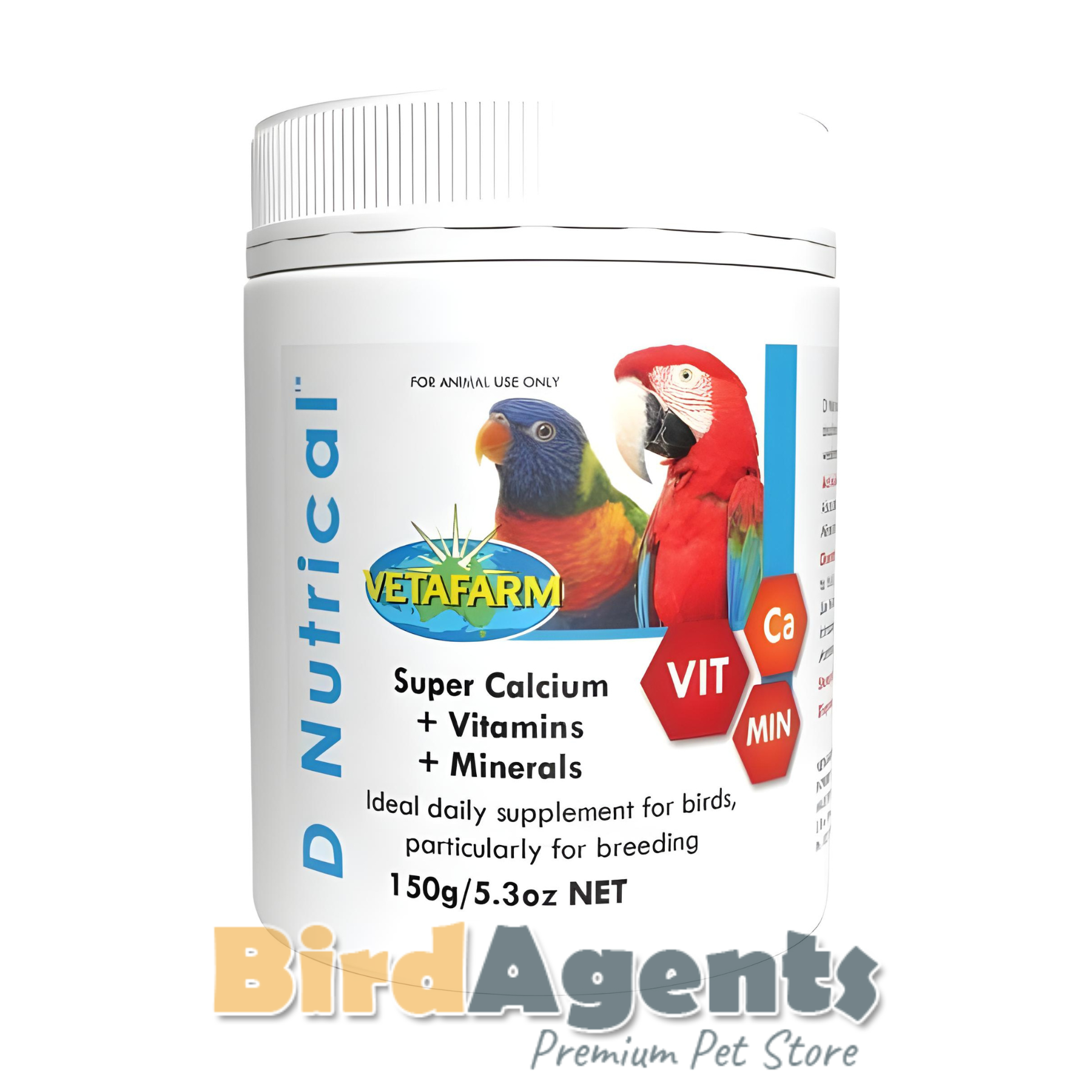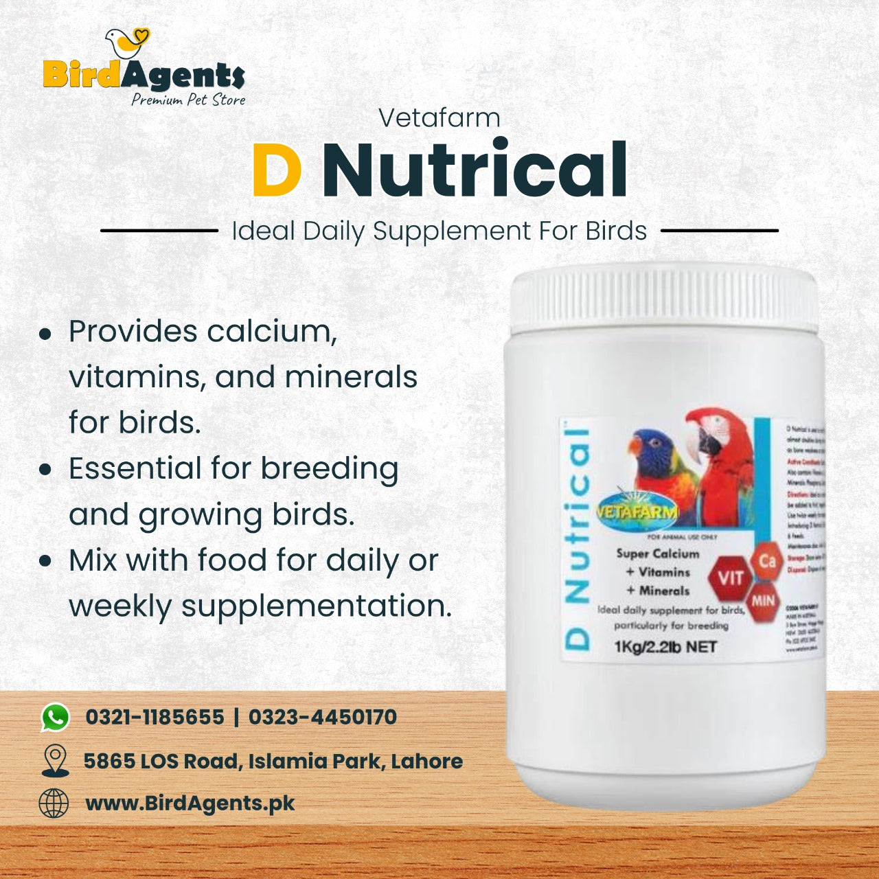 D Nutrical is a complete calcium and vitamin supplement for birds, ensuring strong bones, better breeding success, and long-term health.