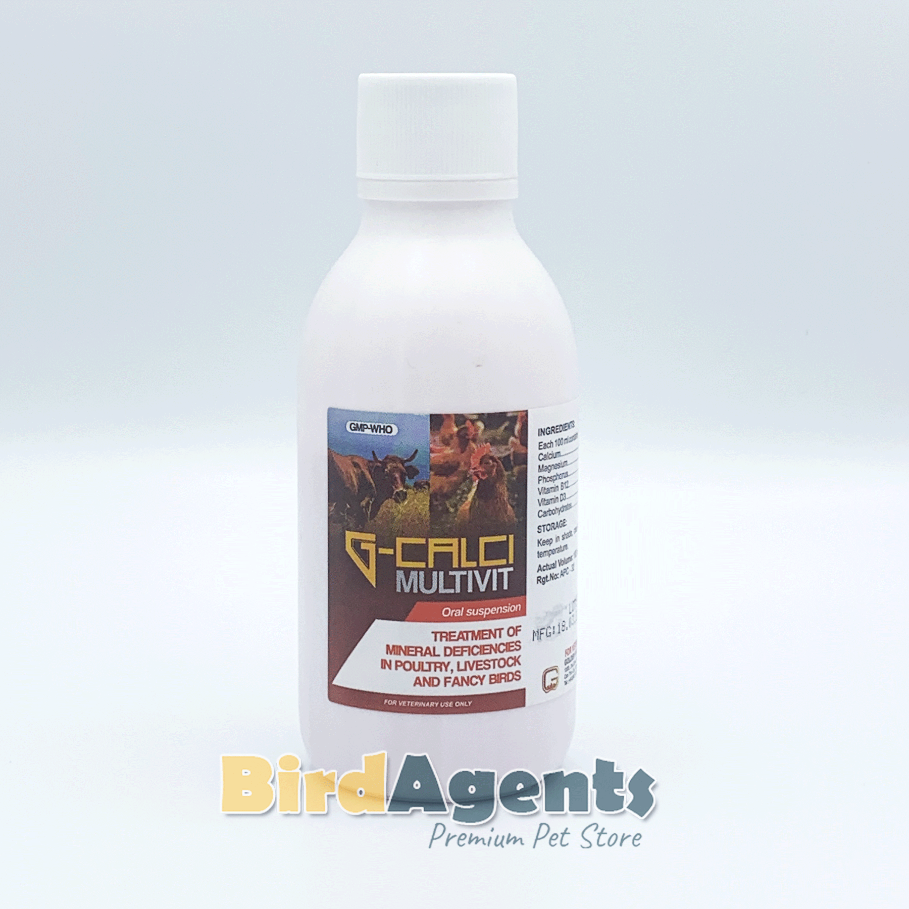 G Calci Multivit Oral Suspension is a high-quality calcium and multivitamin supplement formulated to promote strong bones, improved eggshell quality, and overall vitality in fancy birds, pigeons, poultry, and other animals. Enriched with essential minerals and vitamins, it supports breeding performance, enhances metabolism, and helps prevent nutritional deficiencies. Ideal for maintaining health during growth, breeding, and recovery periods, it acts as a powerful tonic for optimal performance and well-being.