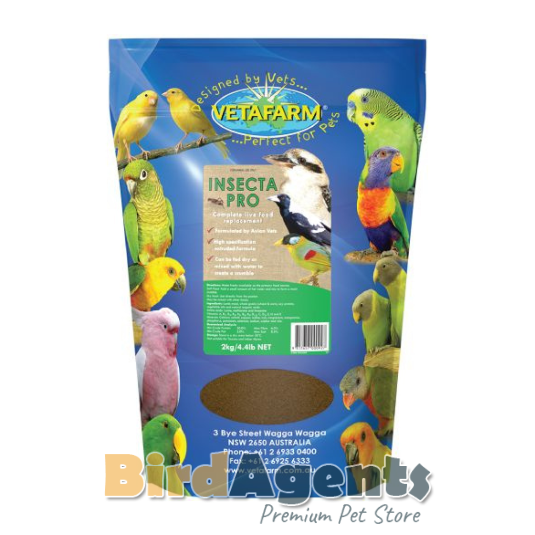Description: Insecta Pro is a fully extruded dietary additive specifically designed for insectivorous birds, such as magpies, kookaburras, and finches. This unique powdered diet serves as a complete live food replacement, providing high fat and protein content essential for these birds.