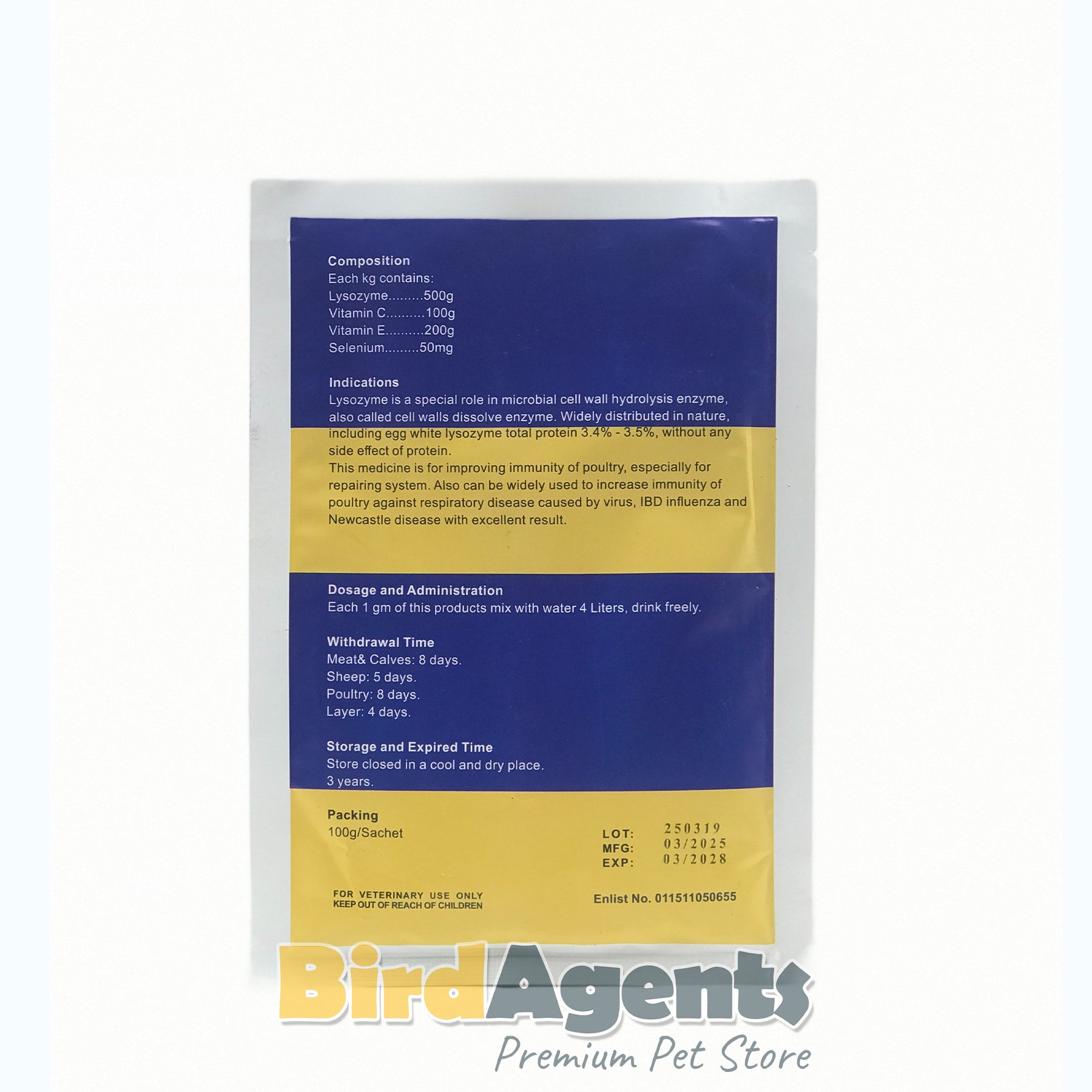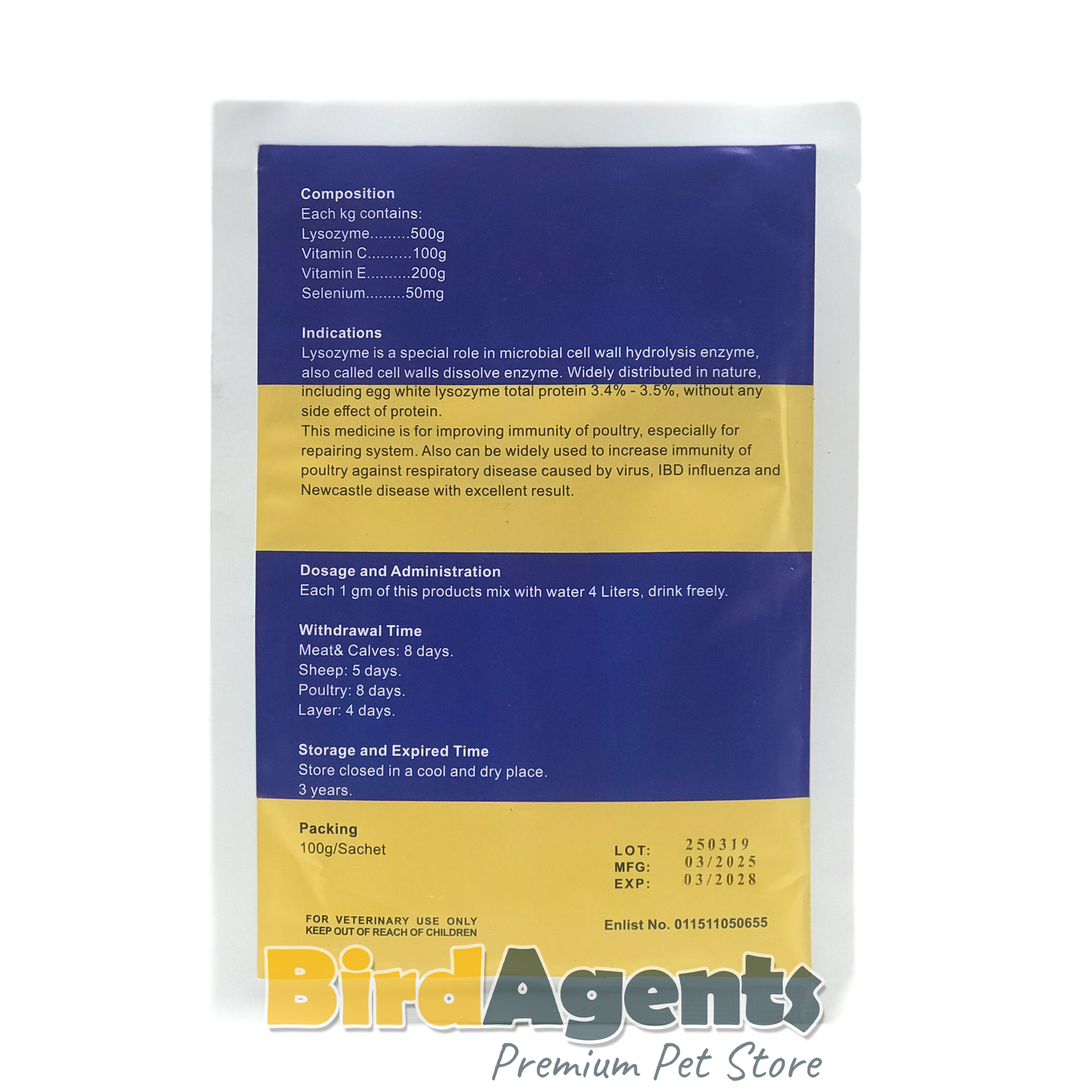 Lyzo Extra is a powerful immune-boosting supplement formulated to enhance the natural defense system and overall health of poultry. Enriched with Lysozyme, Vitamins C & E, Selenium, and Zinc, it strengthens resistance against viral respiratory diseases such as Infectious Bursal Disease (IBD), Influenza, and Newcastle Disease.