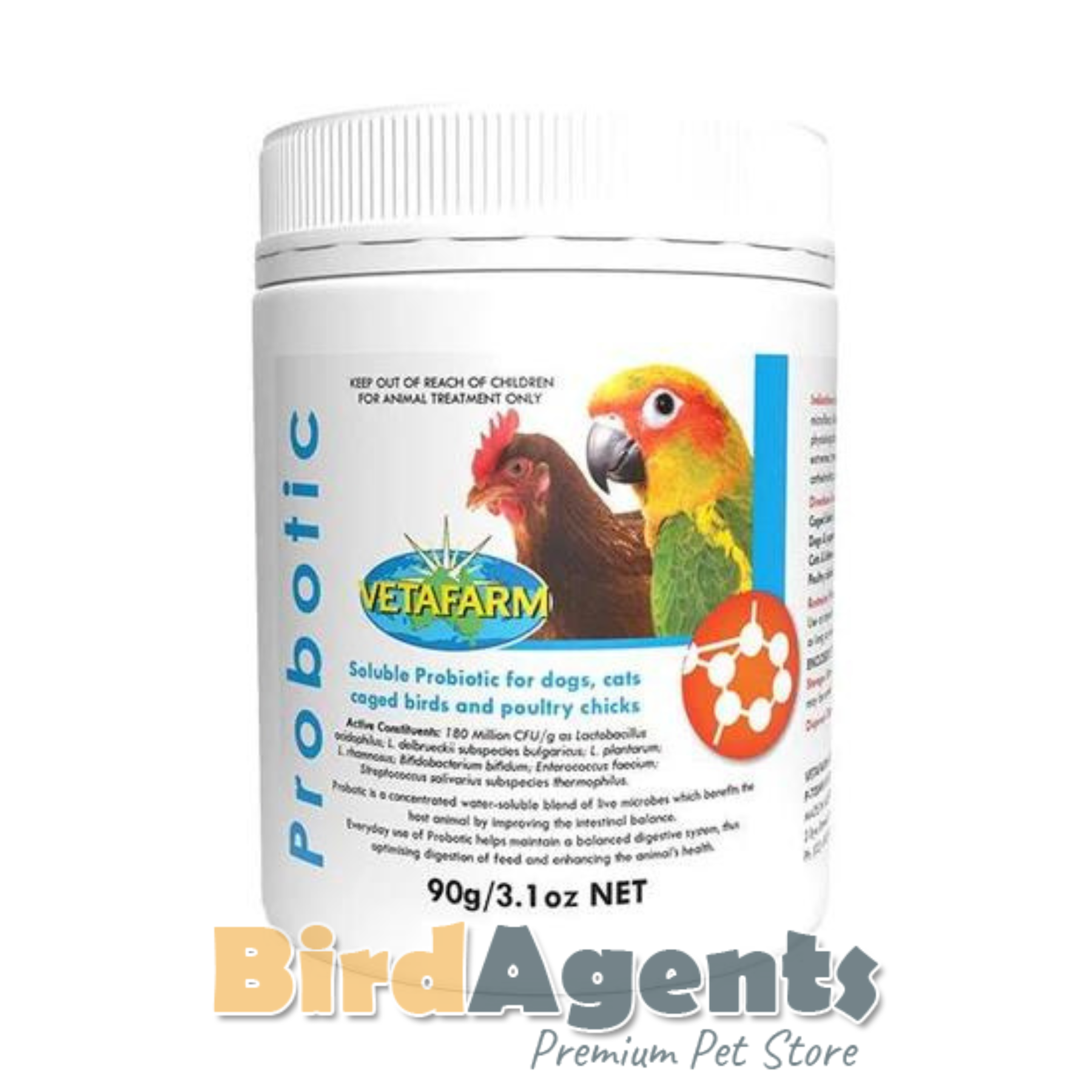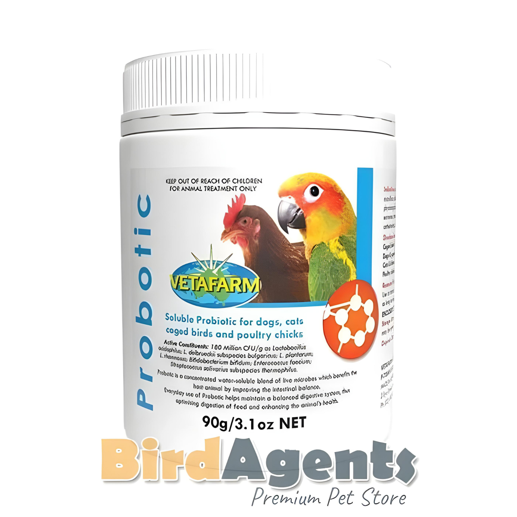 Description: Vetafarm's Probiotic Formula is a powdered blend of seven live microbes designed to naturally re-establish gut flora in birds following infections, diarrhea, stress, or antibiotic use. It is suitable for all bird species, including cage and aviary birds, pigeons, and backyard chickens/poultry.