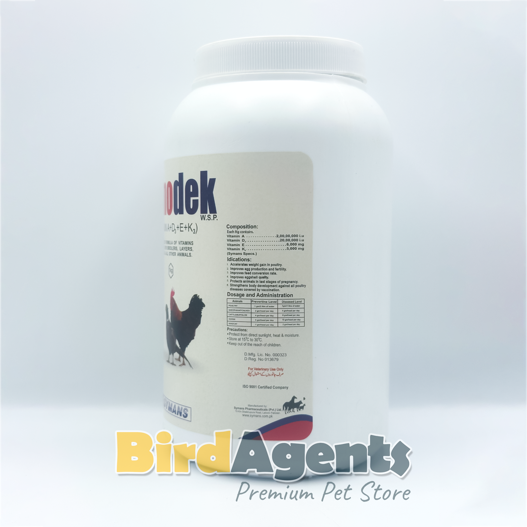 Symodek ADEK is a premium multivitamin formulation containing essential vitamins A, D₃, E, and K₃. This balanced supplement supports growth, fertility, immunity, and overall well-being in birds and animals. It is ideal for use during breeding, growth, stress, or recovery periods when vitamin demand increases.