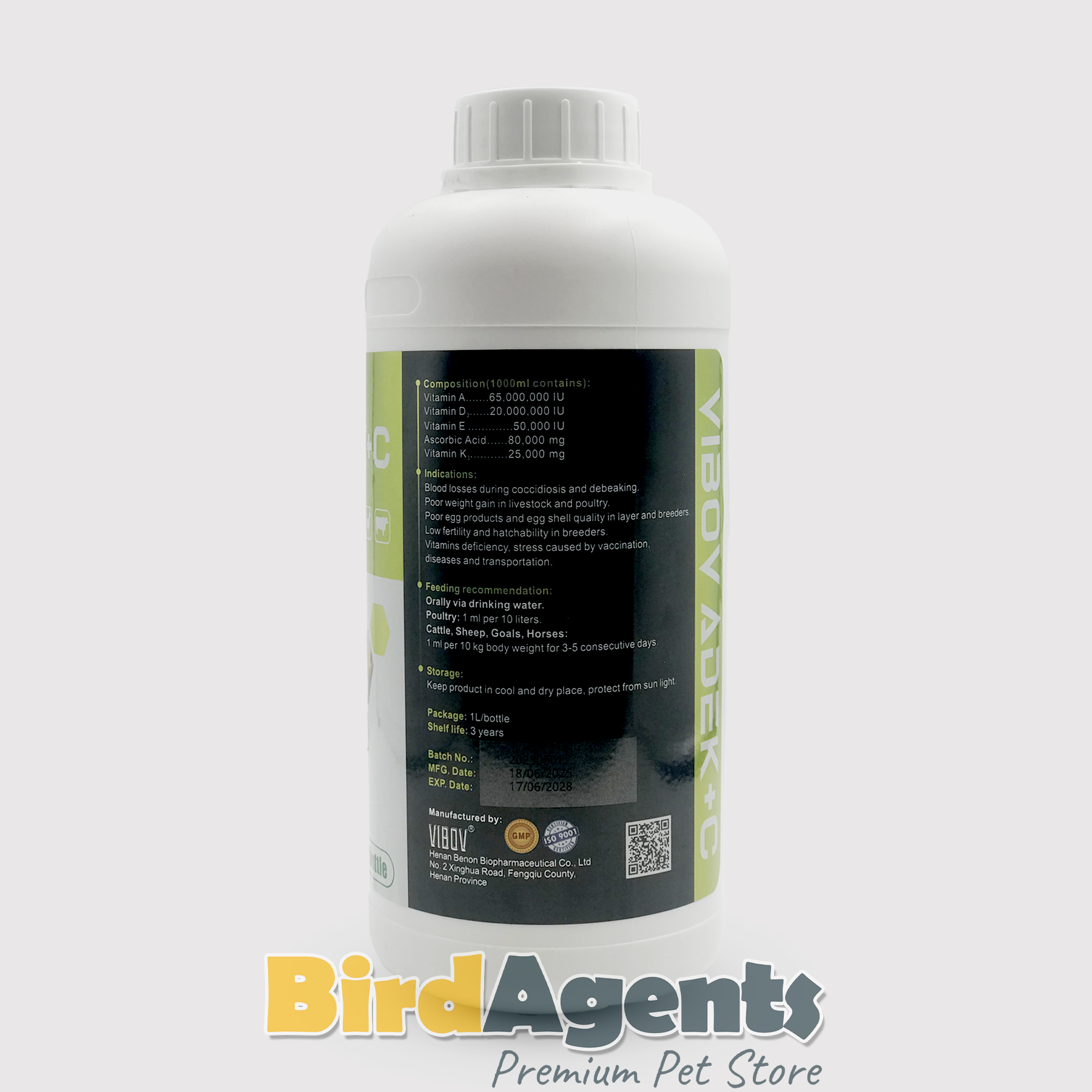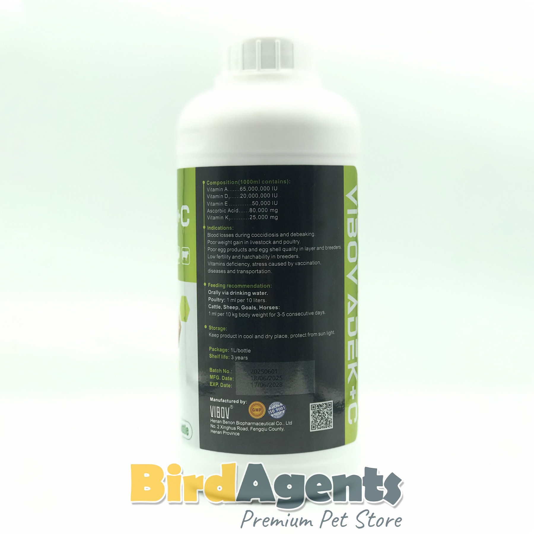 Vibov ADEK+C is a powerful multivitamin solution formulated to support growth, immunity, productivity, and recovery in poultry and livestock. Enriched with high-potency Vitamins A, D₃, E, K₃, and Vitamin C, it is ideal for combating stress, improving egg quality, enhancing hatchability, and boosting overall health performance.